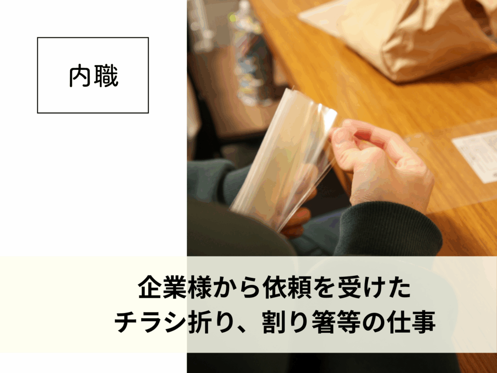 | 01 企業様より内職作業 | ・チラシ折り作業 ・割り箸作業 ・お菓子の箱作り作業等 |